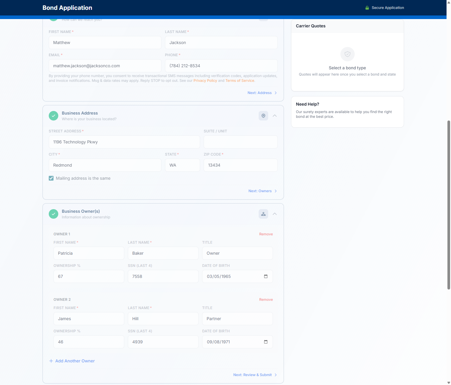 Screenshot of the bond application form where users provide their phone number and consent to receive SMS messages.